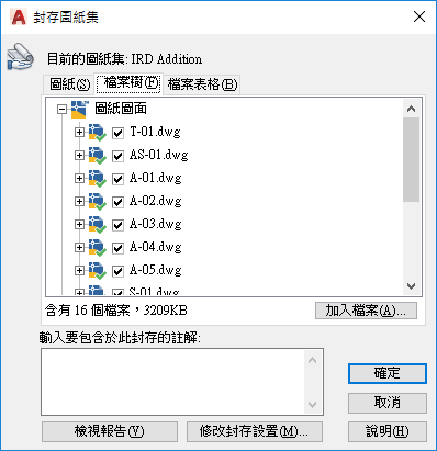 使用階層式樹狀格式清單要併入封存套件中的檔案。依預設,目前圖面的所有相關檔案 (如相關的外部參考、出圖型式和字體) 都會列出。您可以將檔案加入封存套件,也可以移除既有的檔案。URL 所參考的相關檔案不會併入封存套件。