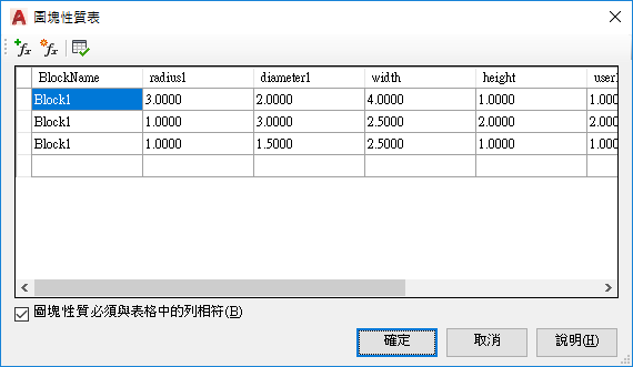 您可以按 Shift+Enter,以在「圖塊性質表」對話方塊中的格線中,為多行屬性值加入新行。