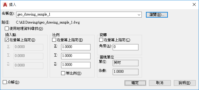 指定要插入的圖塊名稱,或要插入做為圖塊的檔案名稱。
