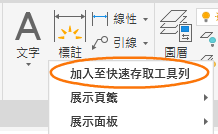 您可以按一下指示的下拉式按鈕,然後從下拉式功能表中按一下您的選擇,輕鬆地將常用的工具加入「快速存取」工具列。
