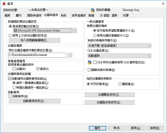 出圖:指定在後台處理出圖工作。此設定也會受到系統變數 BACKGROUNDPLOT 的影響。