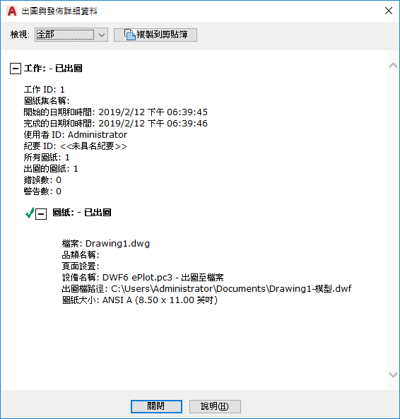 顯示所有已完成的出圖與發佈工作,以及這些工作內圖紙的相關資訊。
