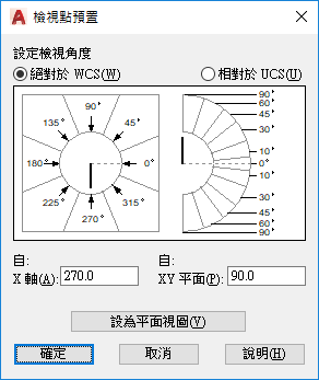相對於世界座標系統 (WCS) 或使用者座標系統 (UCS) 來設定檢視方向。