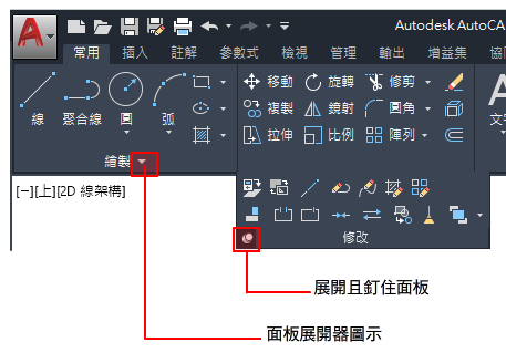 功能區上提供之精簡選項板,具備所有建立或修改您圖面的必需工具。可將其置於以下位置: