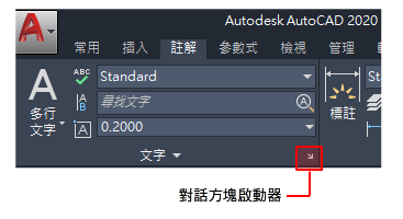 多個功能區頁籤提供存取與該面板相關的對話方塊。若要顯示相關的對話方塊,請按一下面板右下角以箭頭圖示