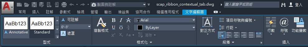 當您選取特定類型的物件或啟動某些指令時,會顯示關聯式功能區頁籤,而非顯示工具列或對話方塊。當您結束該指令時,關聯式頁籤就會關閉。
