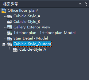 樹狀視圖的頂層永遠展示目前圖面。參考檔案顯示在下一層。可以開啟包含自己的巢狀檔案參考的參考檔案,以展示更深層級。在樹狀視圖中進行選取時,一次只能選取一個檔案參考。