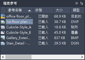 參考名稱欄永遠將目前的圖面顯示為第一個項目,然後以其貼附順序列示其他已貼附檔案。