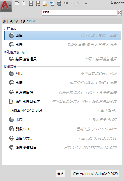 「指令搜尋」欄位會顯示在應用程式功能表的頂部。搜尋結果可能包括功能表指令、基本工具提示和指令提示文字字串。您可以輸入任何語言的搜尋條件。結果會套用至目前的工作區。