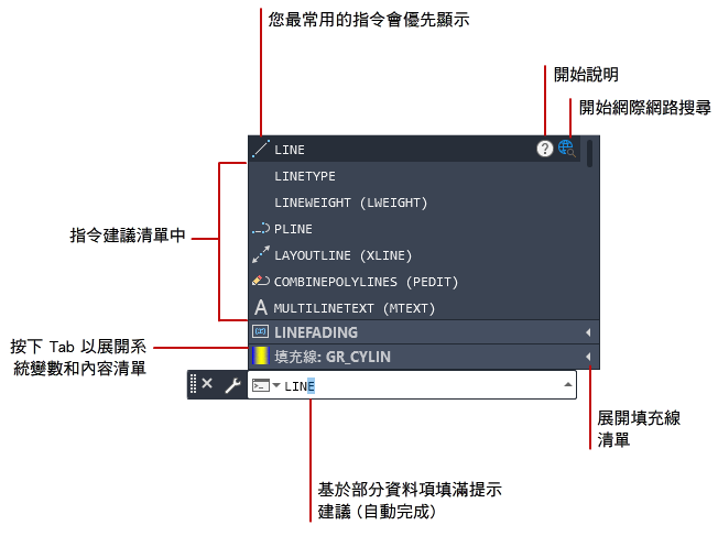 當您在指令視窗中或是動態輸入方塊中輸入指令的前幾個字母時,建議的指令清單會隨即顯示。依預設,清單具有以下特性: