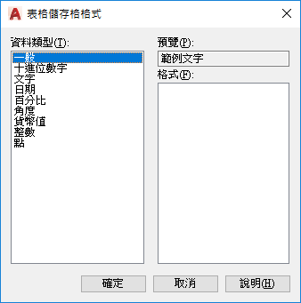 依據所選的資料類型,顯示相關格式類型的清單。例如,如果您選取「角度」做為資料類型,則會顯示「十進位度」、「分度」、「弳度」此類選項。