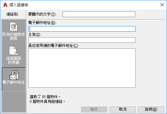 指定要連結的電子郵件位址。當執行超連結時,會利用預設系統電子郵件程式來建立新電子郵件。
