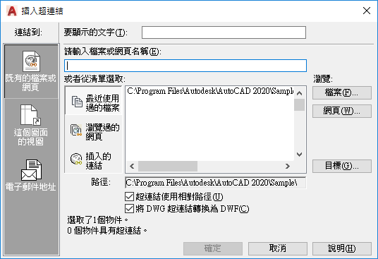 指定與超連結關聯的檔案或網頁。可以在本端網路磁碟或在網際網路或企業內部網路位置上儲存此檔案。