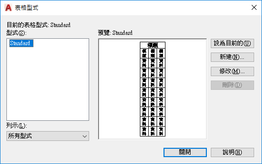 刪除在「型式」清單中選取的表格型式。但無法刪除圖面中正在使用的型式。