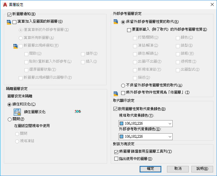 控制是否在目前圖面中顯示外部參考圖層性質取代。