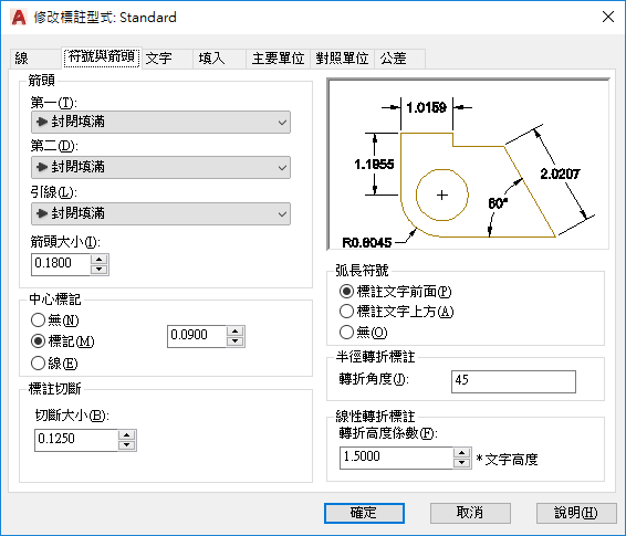 控制直徑標註與徑向標註的中心標記和中心線的外觀。
