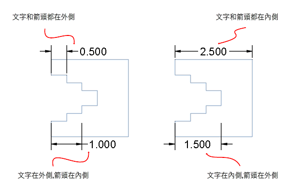 如果延伸線之間沒有文字的位置,您可以有一條自動建立的引線。如果延伸線外面的文字干涉其他幾何圖形,則此項非常有用。例如,在連續式標註中。無論文字是繪製於引線的右側還是左側,文字皆由標註型式中水平對正方式設定控制。