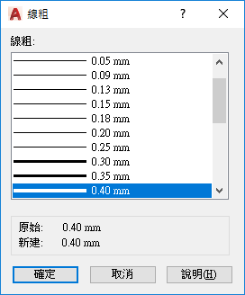 顯示先前的線粗。建立圖層時指定的預設線粗是 DEFAULT (按預設值 0.01 英吋或 0.25 mm 出圖)。(系統變數 LWDEFAULT)