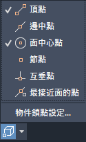 | 查找 | 2D 物件鎖點 | 當您移動游標時鎖點游標至最近的 2D 參考點。例如,端點、圓的中心與中點等。 |