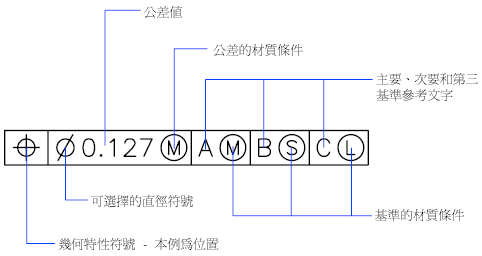 特徵控制框由兩個或多個部分組成。第一個特徵控制框包含的符號代表公差所套用到的幾何特性,例如,位置、輪廓、形狀、方位或偏轉度。成形公差控制平直度、平坦度、真圓度、圓柱度、輪廓控制線與曲面。在圖解中,特性即位置。
