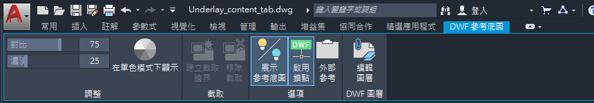 選取圖面中的 DWF 參考底圖時,功能區上會顯示「DWF 參考底圖」關聯式頁籤。