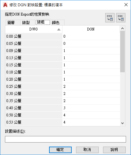 顯示預先定義的一組線粗,這組線粗會提供 DGN 檔和 DWG 檔中使用的線粗的最佳相符。您可以在右欄中使用右鍵功能表複製並貼上一個或多個線粗。僅可在「線粗」頁籤的右欄上進行變更。左欄不可編輯。