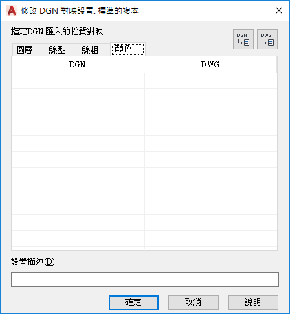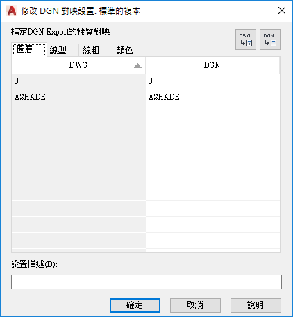 匯出對映設置:如果您已透過從「匯出 DGN 設定」對話方塊中建立新設置來存取「修改 DGN 對映設置」對話方塊,則「DWG」欄將包括目前圖檔中所有已定義的線型。當目標儲存格 (右欄) 為空時,將使用預設系統對映。