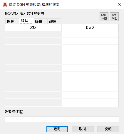 您可以在右欄的儲存格中直接鍵入 DGN 線型名稱。如果將不明的線型名稱加入對映表的右欄,會將其忽略並預設為「連續」。