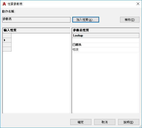 顯示相關聯參數表動作的名稱,您可在「性質」選項板中對其進行編輯。