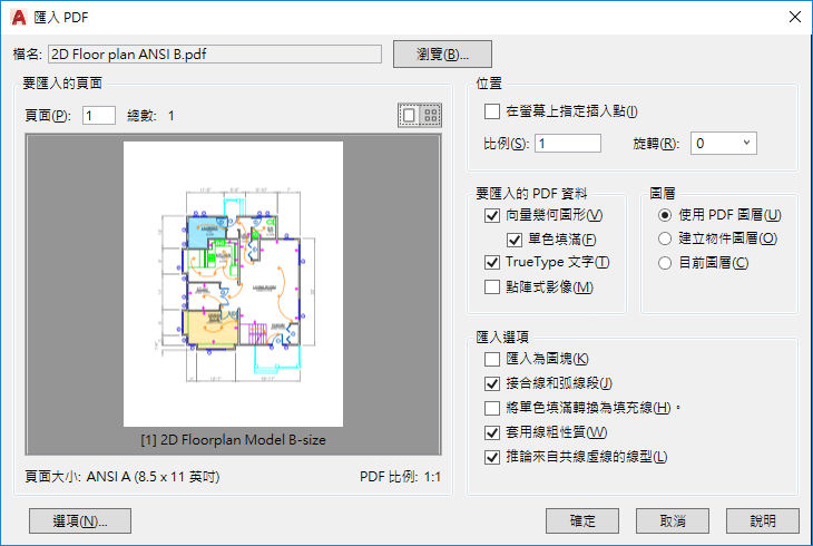 - 您可以為匯入的物件指定其他匯入比例係數。匯入 PDF 檔的頁面時不使用 INSUNITS 系統變數的設定,因為每個頁面可以有不同的比例。