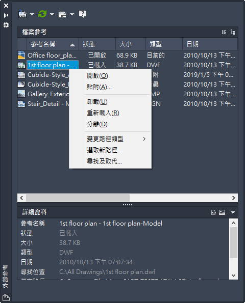 如果您選取的要編輯的參考已貼附外部參考或圖塊定義,則在「參考編輯」對話方塊中會顯示此參考及其巢狀式參考,並可以選取它們。只有在選取的選擇物件是套疊參考的一部分時,套疊參考才會顯示出來。一次只能選取一個參考來編輯。如果您在編輯含有 OLE 物件的參考,將顯示 OLE 物件,但無法選取它們進行編輯。