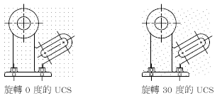 如果需要沿著特定的直線或角度繪製,您可以旋轉使用者座標系統 (UCS) 變更格線和鎖點角度。該旋轉會將螢幕上的十字游標重新對齊以與新角度相符。在以下範例中,UCS 會旋轉 30 度以符合定位架的角度。