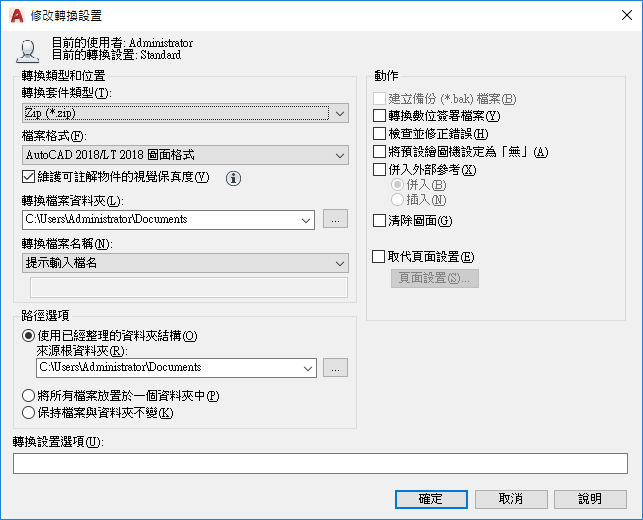 如果此欄位未變更,則將在包含第一個指定圖檔的資料夾中建立轉換檔案。在圖紙集上下文中,在包含圖紙集資料 (DST) 檔的資料夾中建立轉換檔。