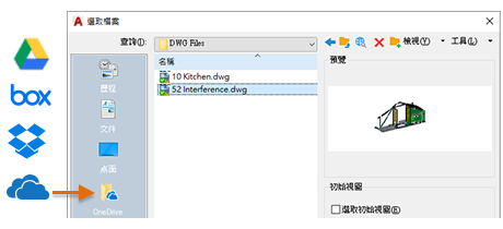 如果您有雲端儲存服務提供者的帳戶,可以將其新增到 AutoCAD 檔案選取對話方塊中的「位置」列,直接導覽至您的雲端儲存服務帳戶中的圖面。只需在「位置」列內按一下右鍵,然後輸入導覽捷徑的名稱和路徑即可。
