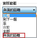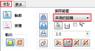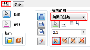 在「造型」頁籤上選取「與面的距離」和「方向 1」或「方向 2」後,使用「更多」頁籤中的選項取得不同的結果。