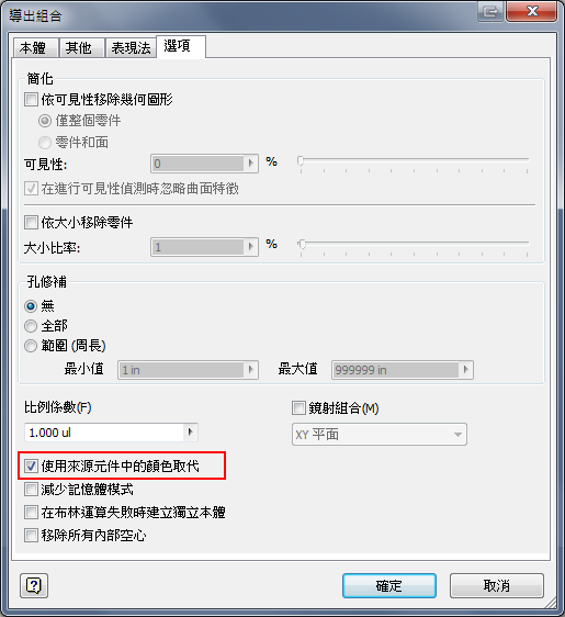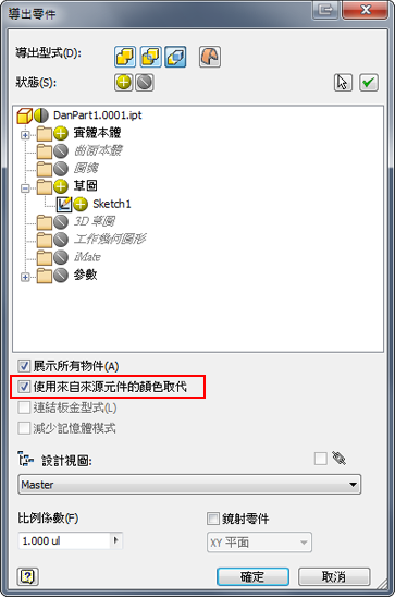 在「導出組合」、「導出零件」、「製作零件」和「製作元件」對話方塊中,提供新的「使用來源元件中的顏色取代」選項。如果勾選此勾選方塊,則會將零件外觀和本體、特徵或套用至面的面顏色取代,從導出零件推入至新零件。如果不勾選此選項,外觀將設定為預設。