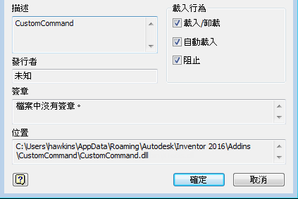 載入非 Autodesk 產品增益集時,會顯示一個新對話方塊。您現在可以選擇允許或阻止載入增益集。此設定將會保留以用於將來的階段作業。您可以使用「增益集管理員」檢查和變更「允許」/「阻止」設定。