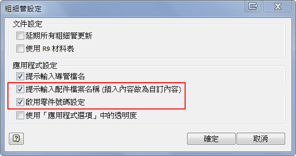 零件號碼設定:透過選取「粗細管設定」對話方塊中的「啟用零件號碼設定」勾選方塊,可使用「零件號碼設定」欄位。此對話方塊中的新選項包括: