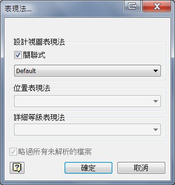 使用新的「表現法」對話方塊,可變更目前設計視圖和關聯性。若要存取這個新的對話方塊,請在表現法的模型瀏覽器中,於「分解」節點上按一下右鍵並選取「簡報」。