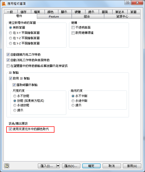 可以將整體設定設為,在整個階段作業中,將「使用來源元件中的顏色取代」預設為保持勾選或不勾選狀態。透過功能區中「工具」頁籤下「設為/導出預設」下的「應用程式選項」對話方塊,可存取此勾選方塊。