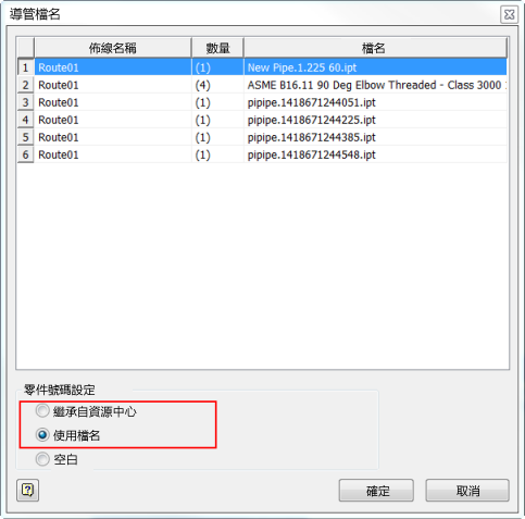 啟用零件號碼設定:可讓您將零件號碼移植到圖面環境內的零件表中。零件號碼會在零件檔內進行更新,然後移植到零件表。此選項還可讓您在「導管檔名」對話方塊中使用「零件號碼設定」選項。