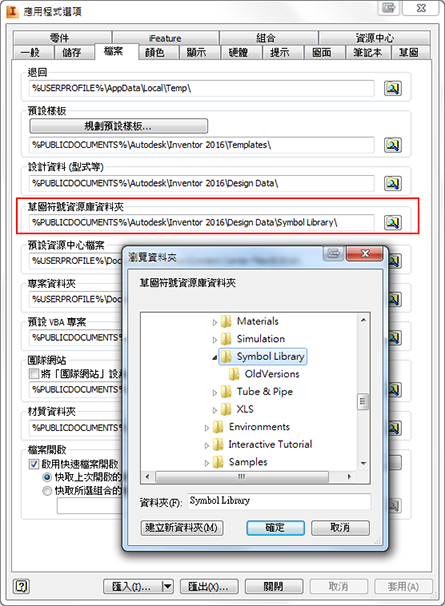 在「應用程式選項」對話方塊的「檔案」頁籤下提供一個新的規劃項目,名為「草圖符號資源庫資料夾」。在這裡,您可以指定位於「設計資料」結構之外的資料夾,以儲存草圖符號資源庫樣板。選取「瀏覽」圖示以尋找檔案,或選取「新資料夾」以建立用於儲存資源庫的位置。