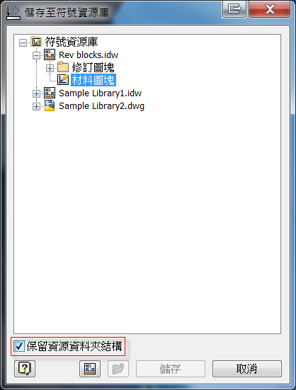 在將草圖符號儲存至資源庫時,請保留您資源庫的資料夾結構。若要完成此作業,請按一下「保留資源資料夾結構」勾選方塊。