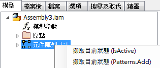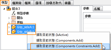 步驟 2 在組合檔中,於「編輯規則」對話方塊的「模型」頁籤中,選取多個零件名稱,按一下右鍵,然後從關聯式功能表中選取「擷取目前狀態 (Components Constraints.Add)」。 |