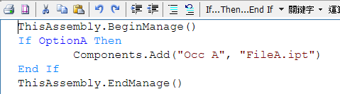 當 EndManage 程式碼執行時:如果 OptionA 為 false,並且組合中已存在名為 Occ A 的元件,則會自動刪除該元件。