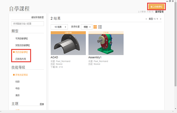 現在,您可以建立自己的自學課程,並以私用或公開方式共用它們。此增強功能向「類型」中加入兩個新的品類。按一下「我的自學課程」,以顯示和管理您建立的自學課程。按一下「與我共用」,以顯示以私用方式與您共用的自學課程。