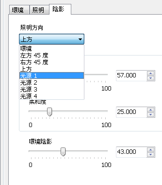 陰影設定由各個照明型式單獨進行管理。這些設定位於「型式編輯器」使用者介面的「陰影」頁籤上。新選項「環境」使用環境影像來定義陰影方向。