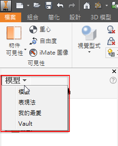 「自訂」指令中的可規劃鍵盤快速鍵指令。此增強功能可讓您向前或向後循環檢視 Inventor 模型瀏覽器中的可用瀏覽器窗格;例如:「我的最愛」、「表現法」和「Vault」。