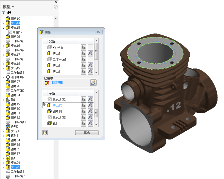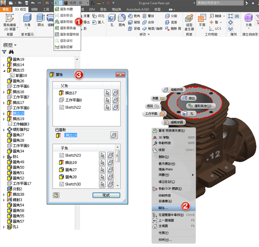 在零件環境中,您現在可以透過模型瀏覽器或圖形視窗,輕鬆從零件中存取父系/子系特徵關係。這個新的交互式對話方塊可讓您直接從零件中檢視特徵相依性。在「關係」對話方塊中,選取
