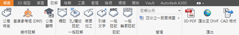 若要存取 3D 註解指令,請在零件檔中使用新的「註解」頁籤,並將製造資訊直接加入至 3D 模型。